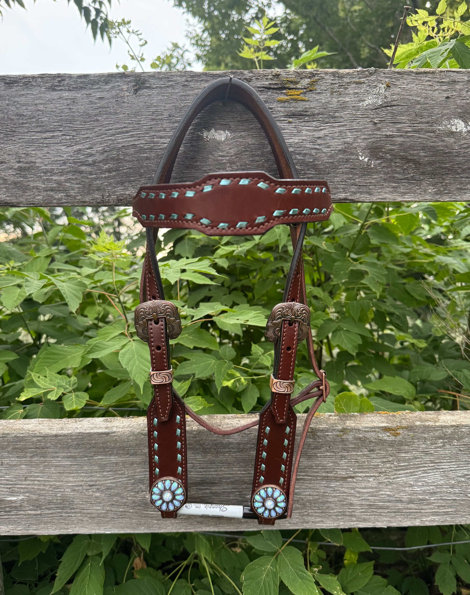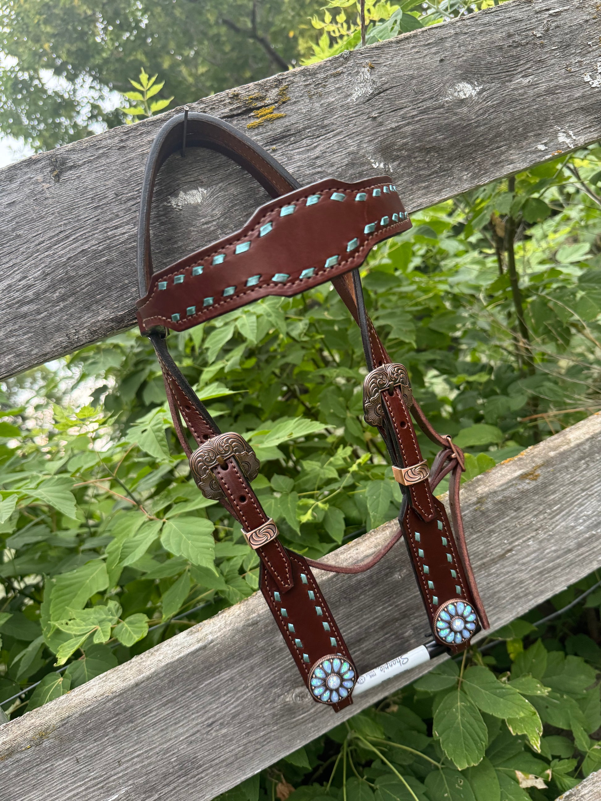 Ice blue browband headstall, made with grade 1 bridle leather. Measures 31"-41" adjustable