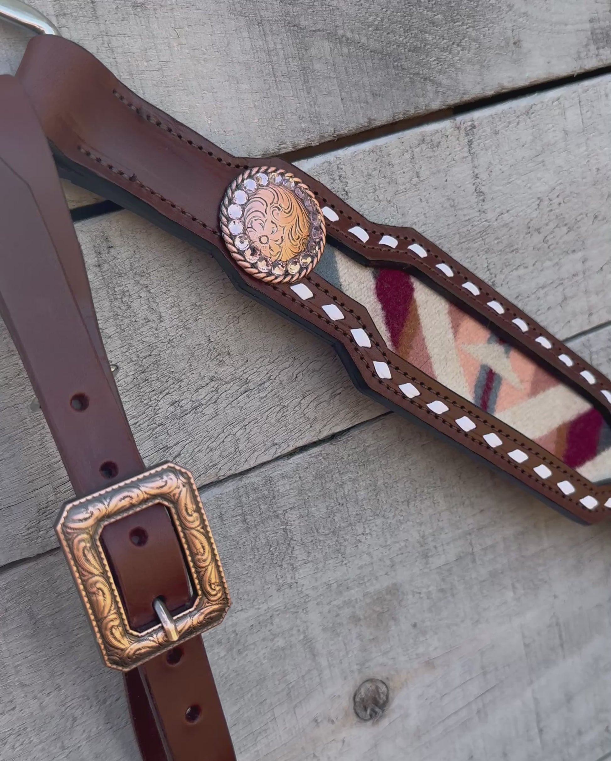 Made with grade 1 hickory brown bridle leather backed with grade 1 Latigo leather! Conchos feature rose colored crystals. Genuine Pendleton wool inlay! Sized to fit an average quarter horse.